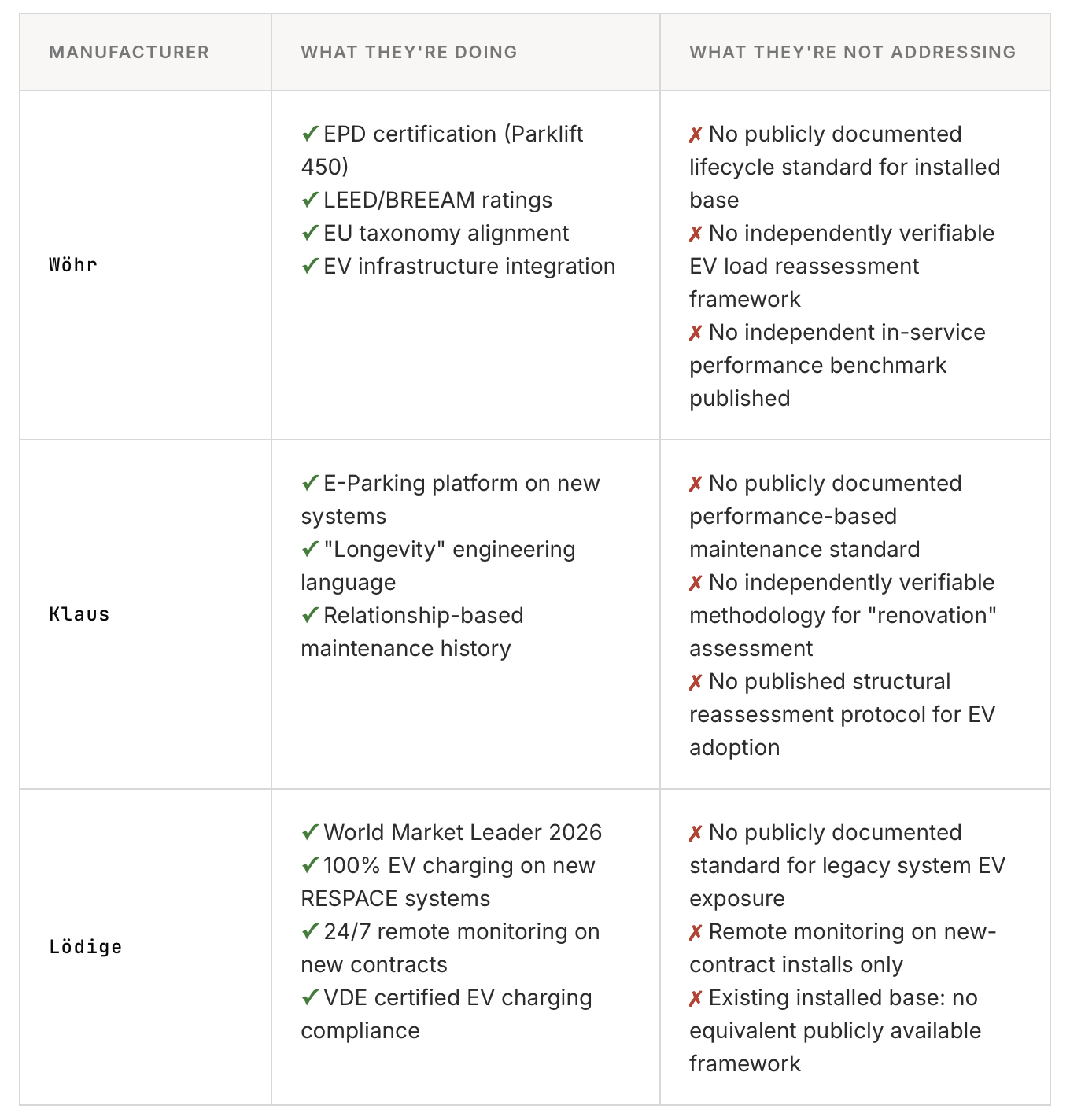 Read that table carefully. Every major manufacturer is investing heavily in making their new products sustainable, verifiable, and EV-ready. None of them publicly present an independently verifiable framework for assessing the performance of the existing installed base.